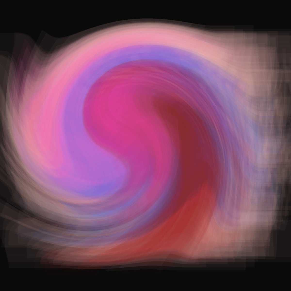 The first experiments were built around a single object simulating a digital brushstroke. Each stroke was drawn line by line with a slight, smooth random offset to mimic the fluid imperfection of a hand. Opacity ranged between 1 and 10 (on a scale of 255), producing a translucent layering effect. With thousands of strokes and carefully harmonized color palettes, textures began to appear — complex, organic, and softly blurred.